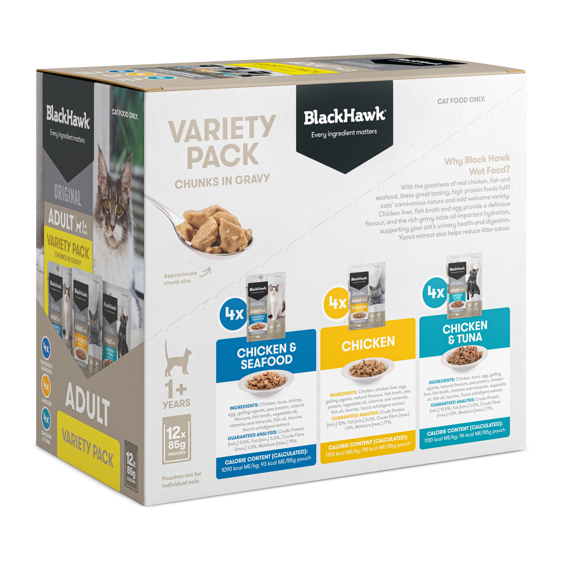 Black Hawk cat foods are formulated to meet the nutritional levels established in the AAFCO Cat Food Nutrient Profiles for maintenance.