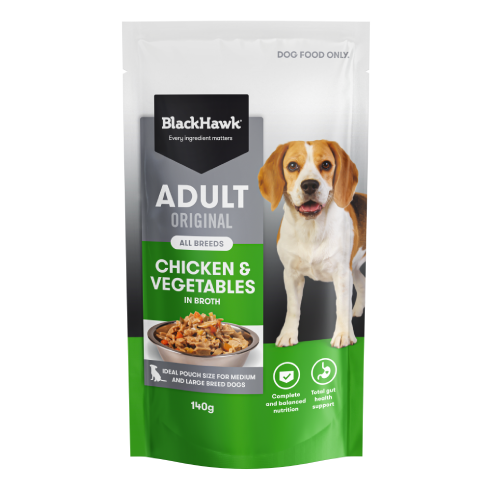 As a pet parent, it’s natural to want to offer your dog a range of textures and flavours. Black Hawk’s new Chicken and Vegetables has been specifically designed to help keep mealtimes interesting, without compromising your dog’s balanced nutrition. The wet food is served in a rich and delicious broth, and includes nutritious vegetables and chicken, a highly digestible and versatile protein that’s packed with amino acids essential for building strong bones and muscles.