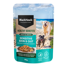 Available in convenient pouches, you can offer this tasty product on its own or use it as a topper for the Black Hawk Healthy Benefits Sensitive Skin and Gut dry food.